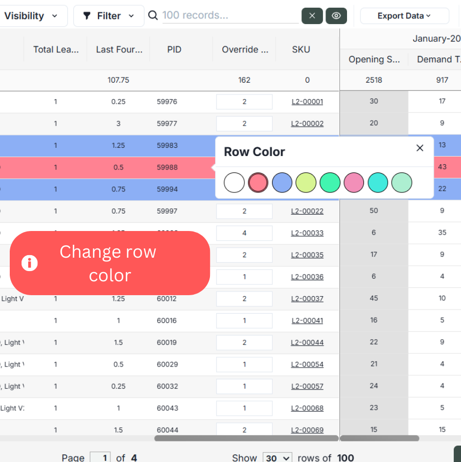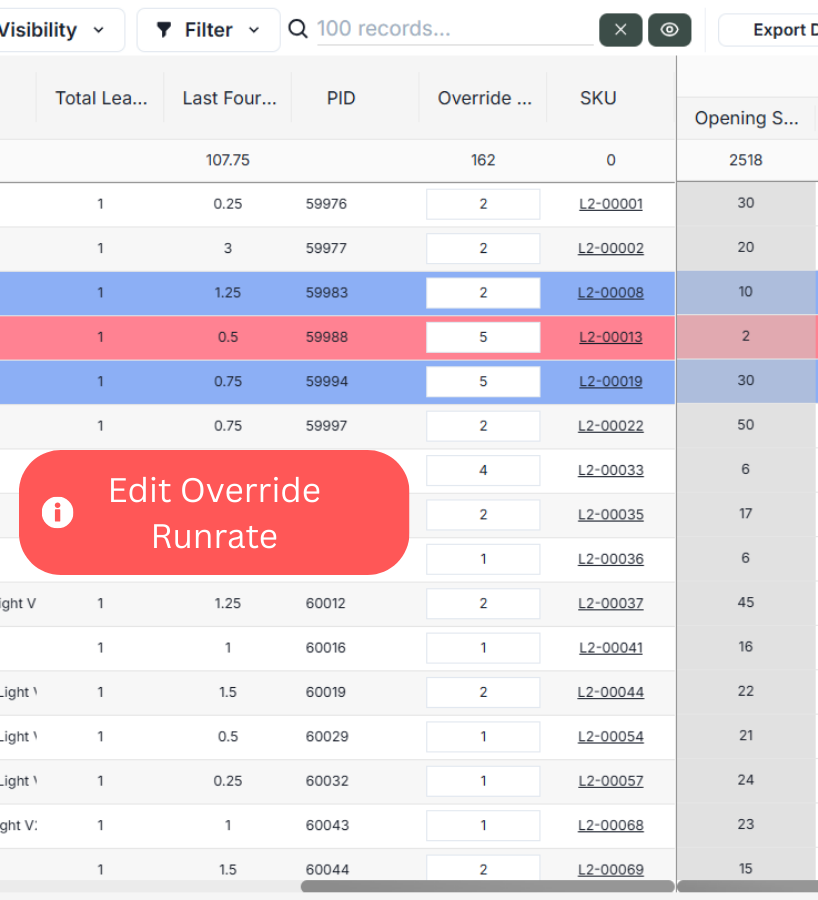 Lists products (Name, Category, Last 4 Weeks Avg, PID, Override Run Rate, SKU, etc.).