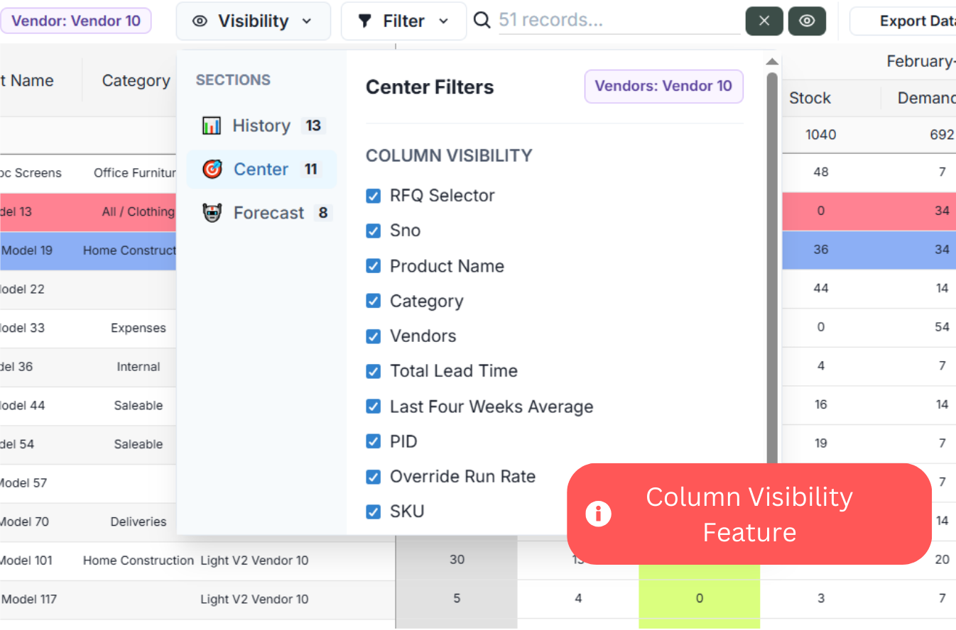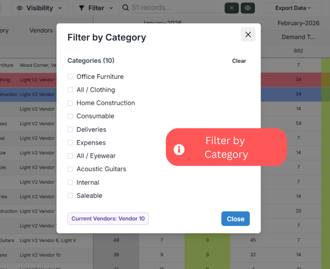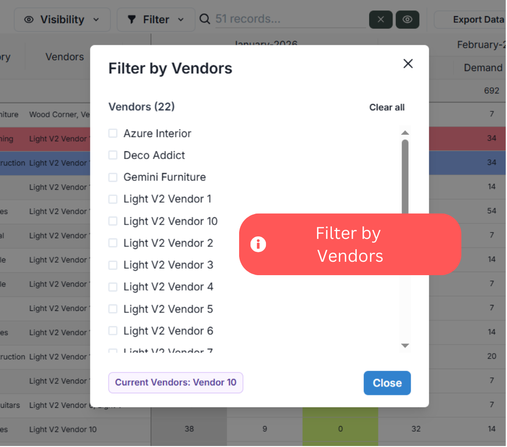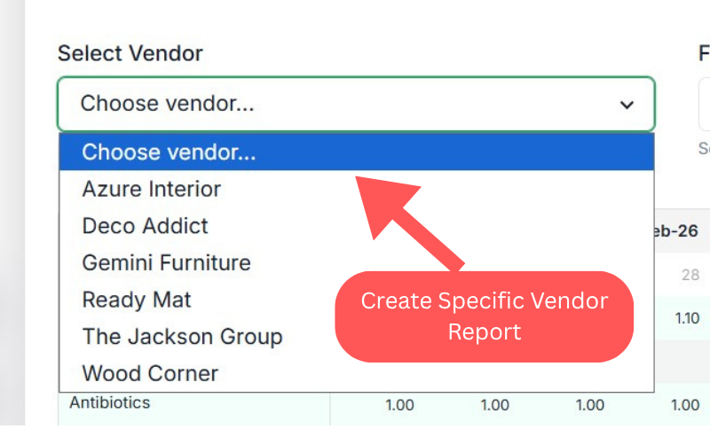 Select Vendor Creates vendor-specific report | Open the vendor dropdown and pick the vendor you want to analyze. Note: Choosing multiple vendors prevents RFQ creation Tip: Choose the vendor you purchase from most frequently | ![]() |