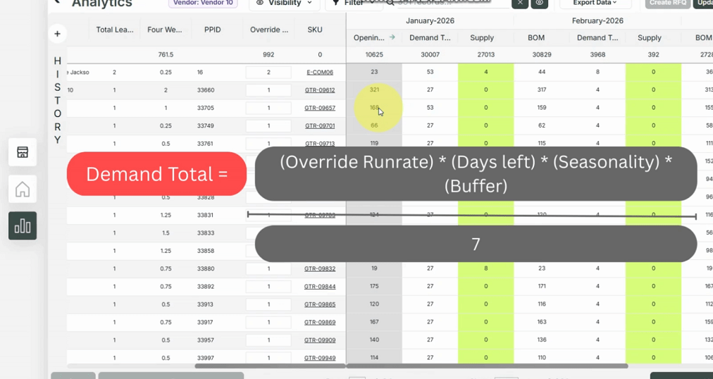 Demand Total depends on Override Run Rate, Days Left, Seasonality, and Buffer.