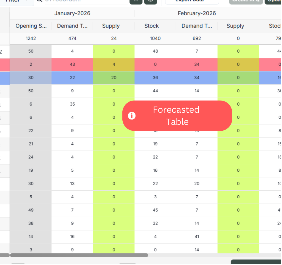 Shows month-wise forecasting result including Demand, Supply, and Stock calculations.