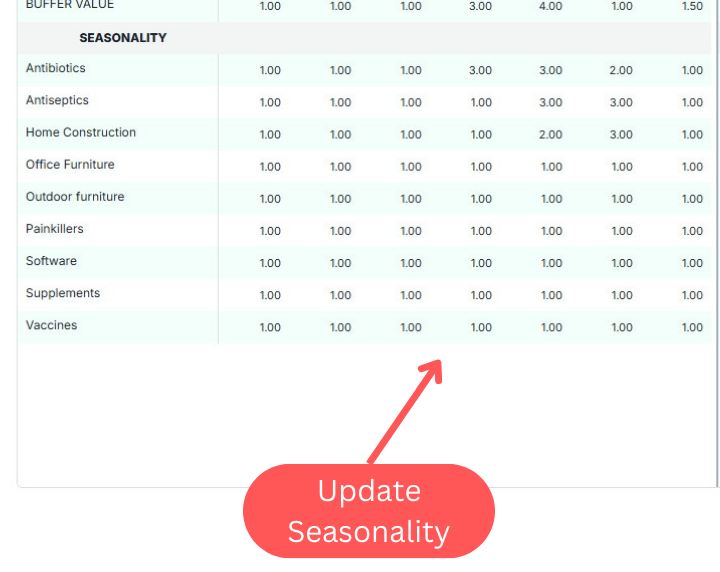 Buffer Safety multiplier | Buffer slightly inflates demand to protect against stockouts. Keep Buffer small unless you have frequent stockouts. Use Seasonality for predictable peaks (festivals, summer, etc.). | ![]() |