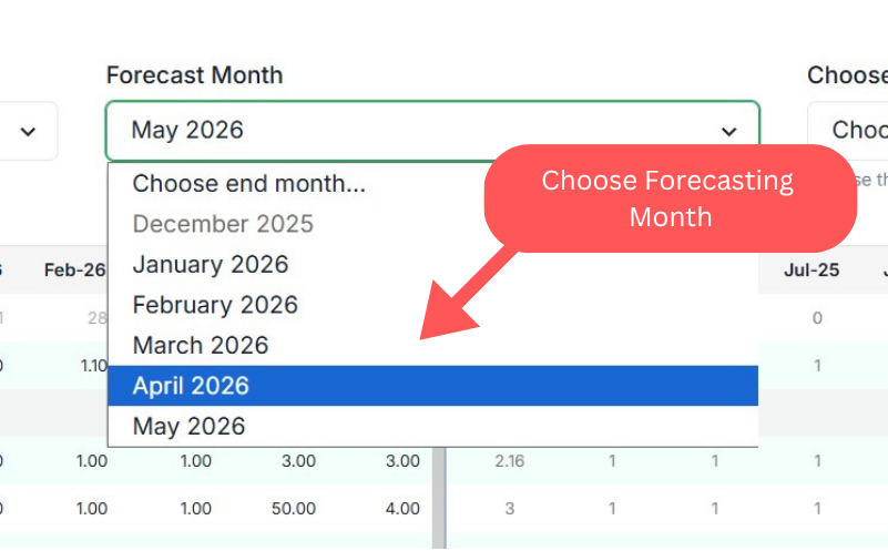 Forecast Month Defines the forecasting window | Choose the month range you want to forecast. Example: Dec 2025 → May 2026 | ![]() |